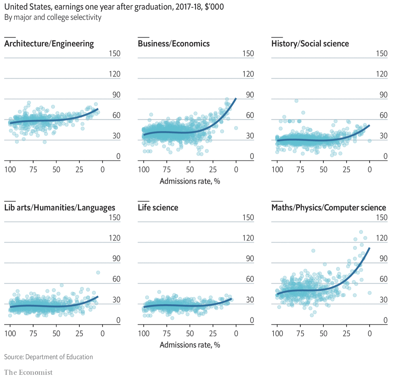 아래 그래프는 미국 학부 졸업 1년 후의 대학 입결 대 연봉의 관계를 전공 별로 보여주고 있다.