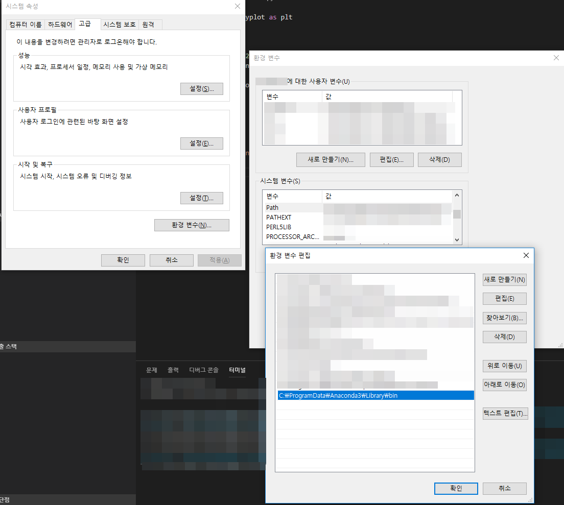 이번의 경우 C:\ProgramData\Anaconda3\Library\bin 추가