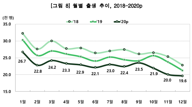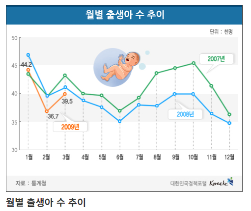 2007~2009년 월별 출생아 수 추이에 따르면 1~3월의 V자 패턴은 유사하나, 10월 주변의 양상은 2020년 조사와 차이를 보이는 것을 알 수 있다.